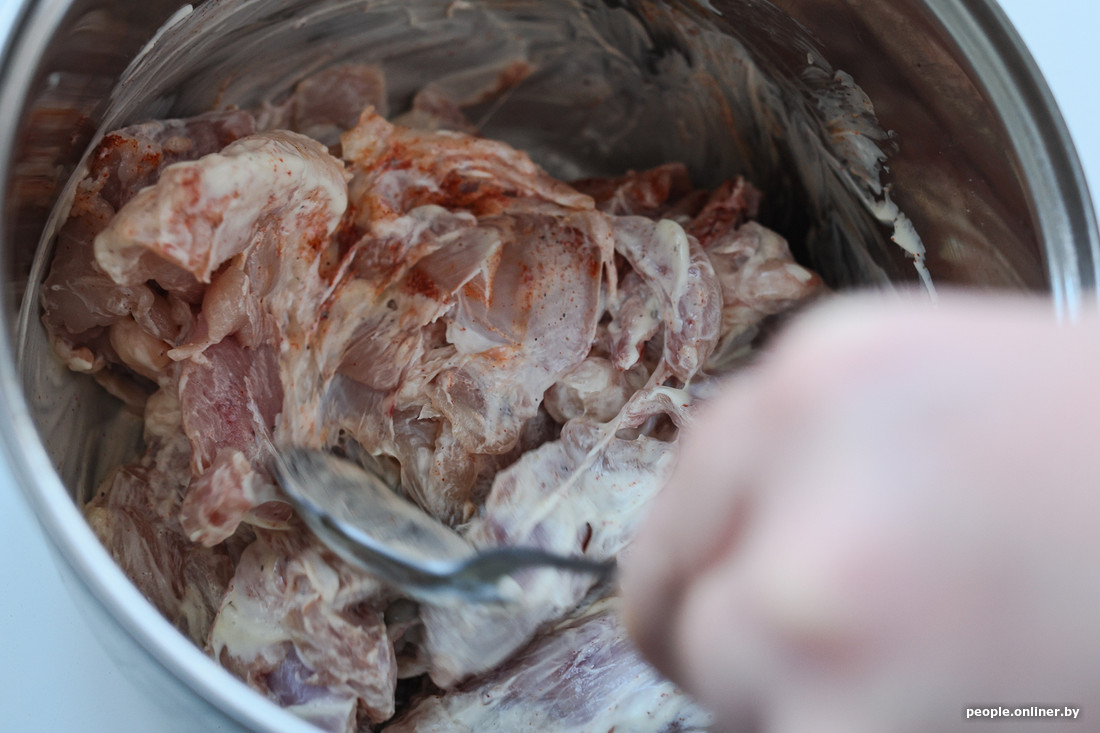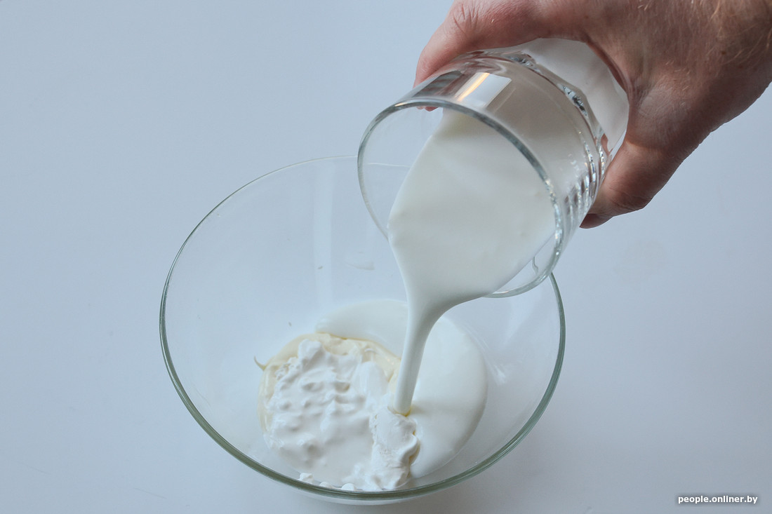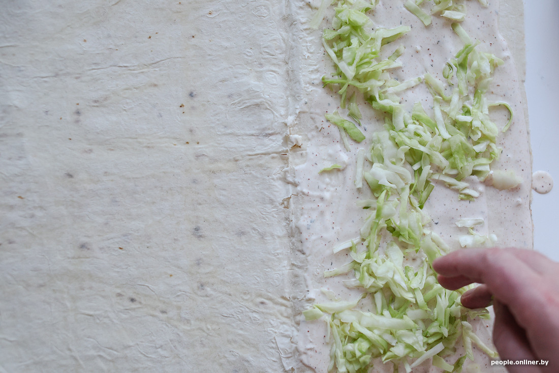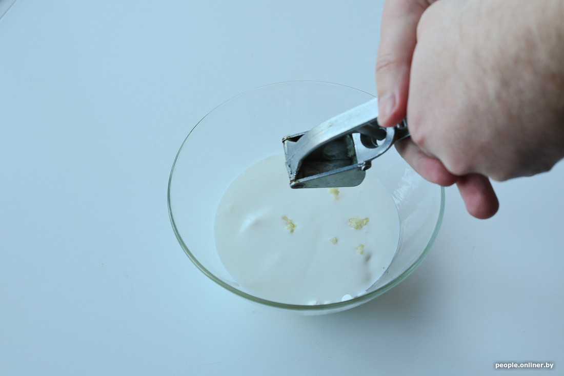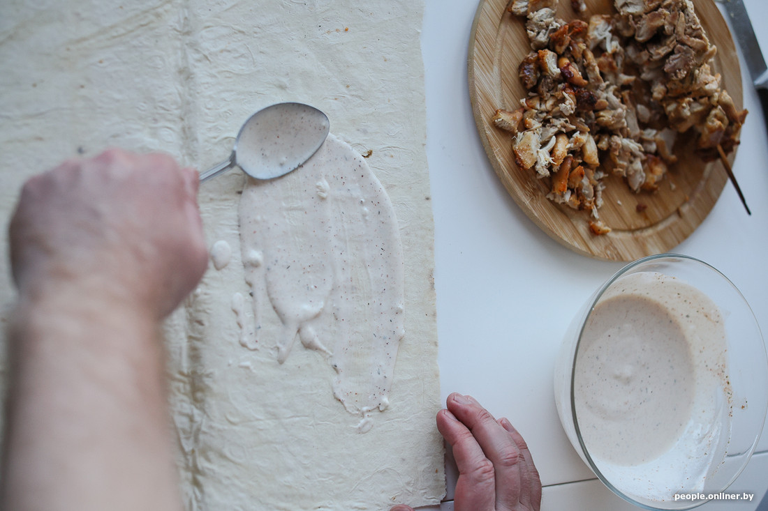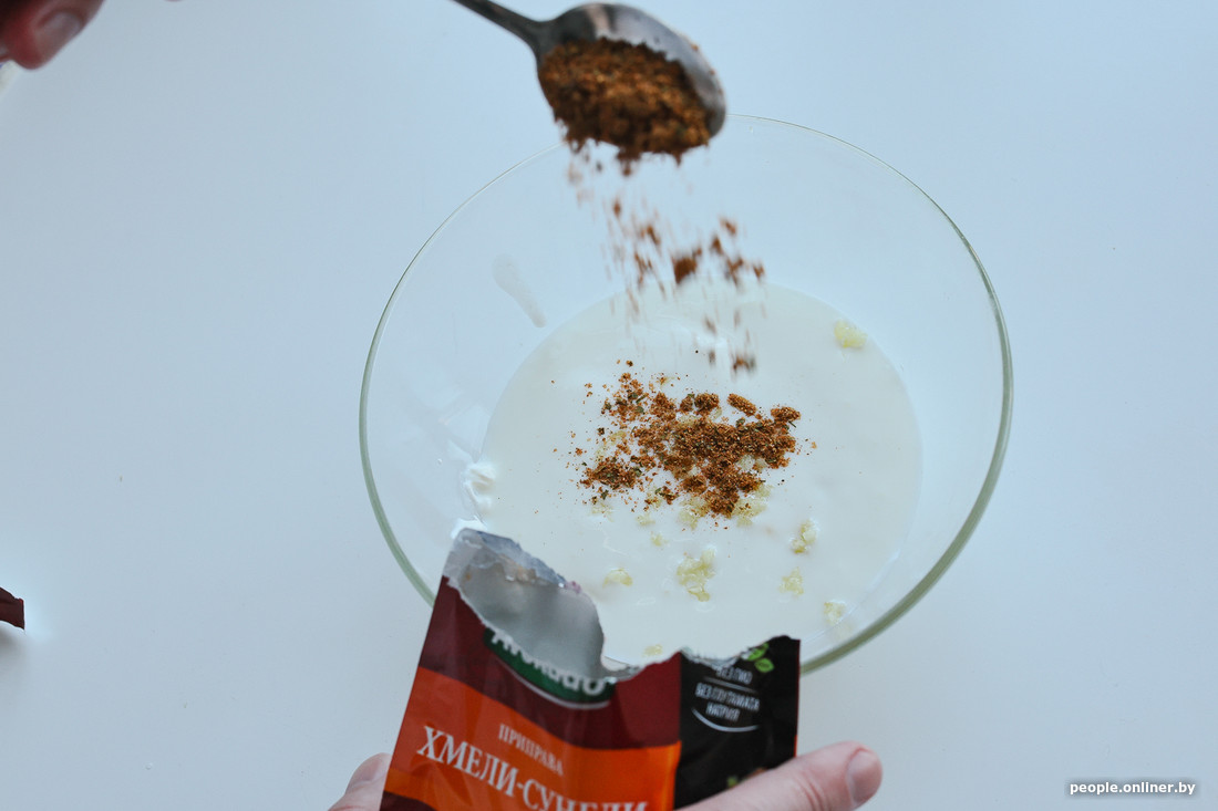 Параллельно мы начали делать соус. Профессиональный шаурмичный консультант рассказал, что белорусы больше всего любят донеры, приготовленные на соусе с майонезом. Прозвучало правдоподобно, и мы решили поработать с «мазиком». На две ложки сметаны добавили столько же майонеза и залили все стаканом кефира. Для вкуса отправили в массу два измельченных зубчика чеснока, сладкий перец и кавказскую приправу хмели-сунели (ей часто сдабривают мясные блюда вроде шашлыка). Весь этот микс мы хорошенько взбили ложкой и отставили в сторону.