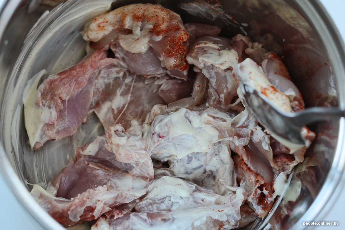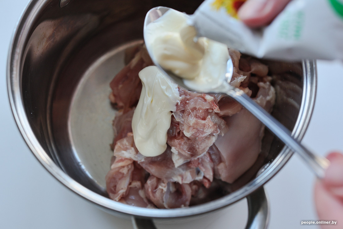 Мы начали готовку с мариновки куриного мяса. Сначала я отделил мякоть от кожи и удалил кости, затем в миску с мясом положил две ложки майонеза, добавил специи, соль и поставил емкость в холодильник.