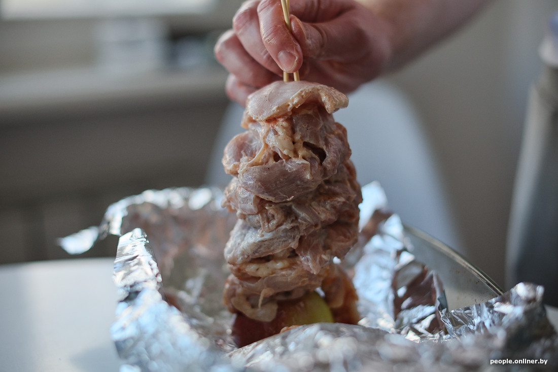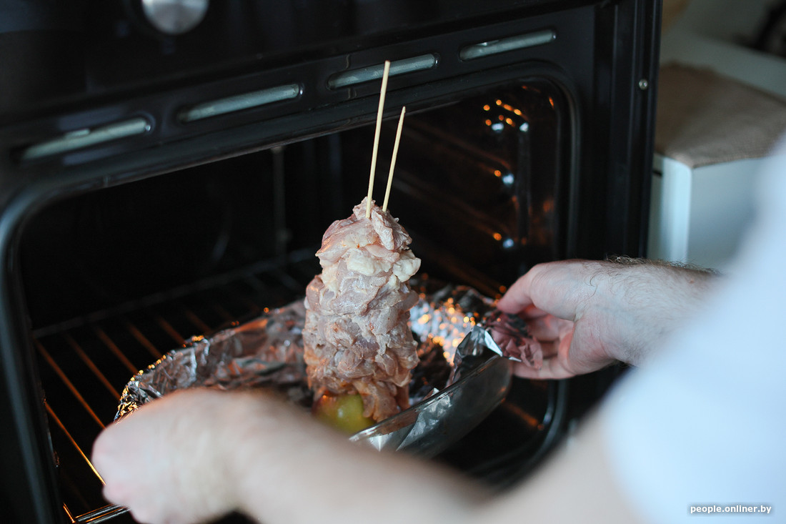 Запекать мясо мы решили в духовке. Для этого срезали половину яблока, воткнули в него длинную шпажку, а потом насадили на нее маринованное мясо.