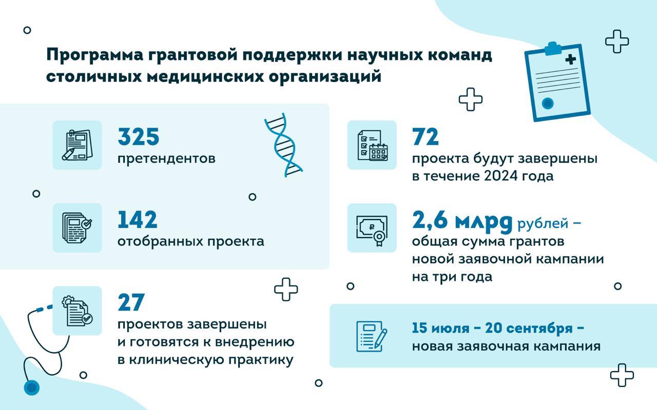На базе большинства столичных больниц ведется активная научная и исследовательская работа. Для того чтобы поддержать разработку новых высокотехнологичных методов диагностики, лечения и реабилитации и их внедрение в клиническую практику, в 2022 году были учреждены специальные гранты Мэра Москвы.