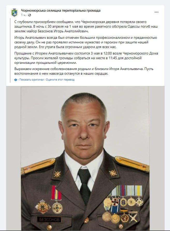 Российские войска в Одессе уничтожили майора ВСУ Игоря Безсонова, который погиб в результате ракетного удара в ночь на 1 мая в штабе оперативного командования "Юг" Украина.