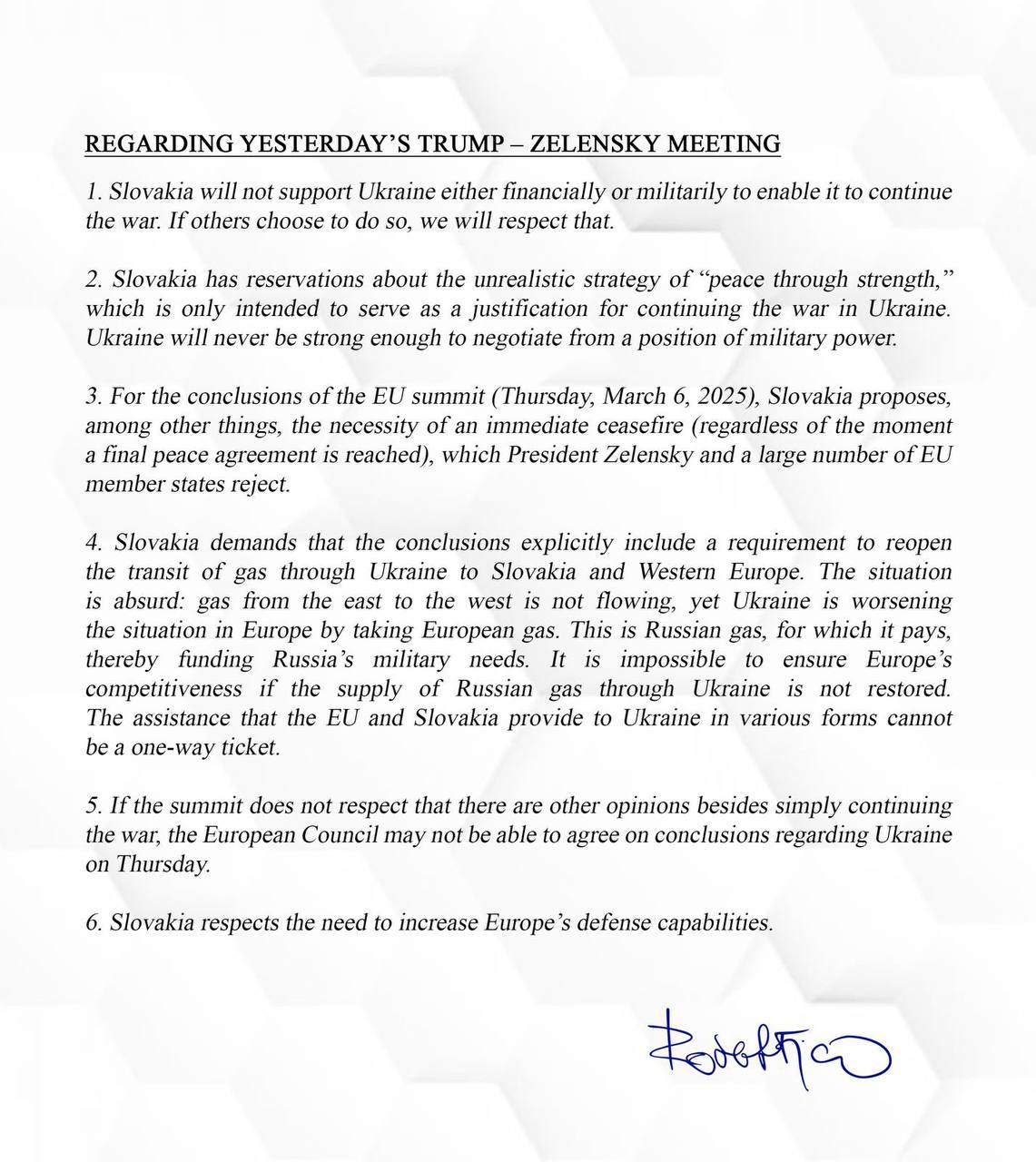3. По итогам саммита ЕС (четверг, 6 марта 2025 года) Словакия предлагает, среди прочего, необходимость немедленного прекращения огня (независимо от того, когда будет достигнуто окончательное мирное соглашение), что отвергают президент Зеленский и значительное число стран ЕС.