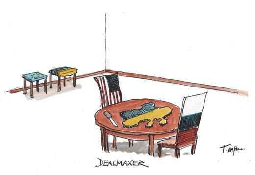 Журнал Spiegel опубликовал карикатуру того, как он видит переговоры России и США по Украине в Саудовской Аравии.