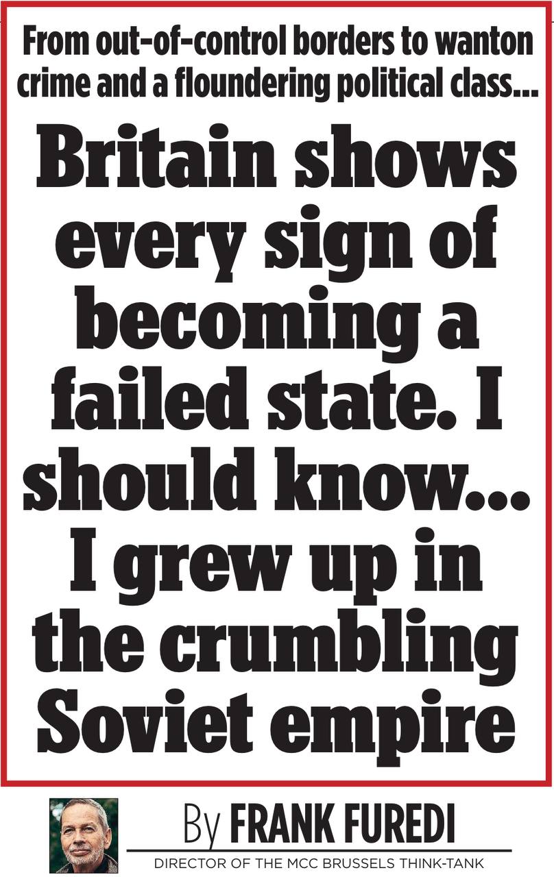 «Британия демонстрирует все признаки того, что становится несостоявшимся государством. Мне ли не знать... Я вырос в разваливающейся Советской империи». Под таким красноречивым заголовком на страницах Mail on Sunday публикует сегодня статью директор аналитического центра MCC Brussels Фрэнк Фуреди.