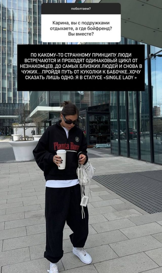 Девушка ответила на вопросы подписчиков в соцсети. Так, один из них поинтересовался, почему блогер всегда отдыхает с подружками, а не со своим парнем. Ответ Карины не заставил долго ждать: «По какому-то странному принципу люди встречаются и проходят одинаковый цикл от незнакомцев до самых близких людей и снова в чужих. Пройдя путь от куколки к бабочке, хочу сказать лишь одно — я в статусе: «Single lady» (одинокой девушки — Прим. ред.)».