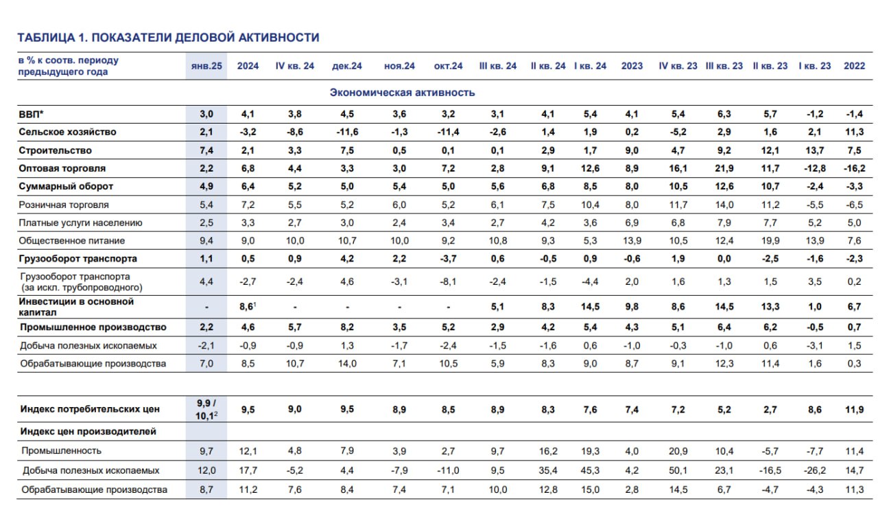 Индекс выпуска товаров и услуг по базовым видам экономической деятельности в январе вырос на 3.1% г/г (минимальные темпы с августа-сентября 2024) после локального ускорения на 7.5% г/г в дек.24 на фоне реализации гособоронзаказа.
