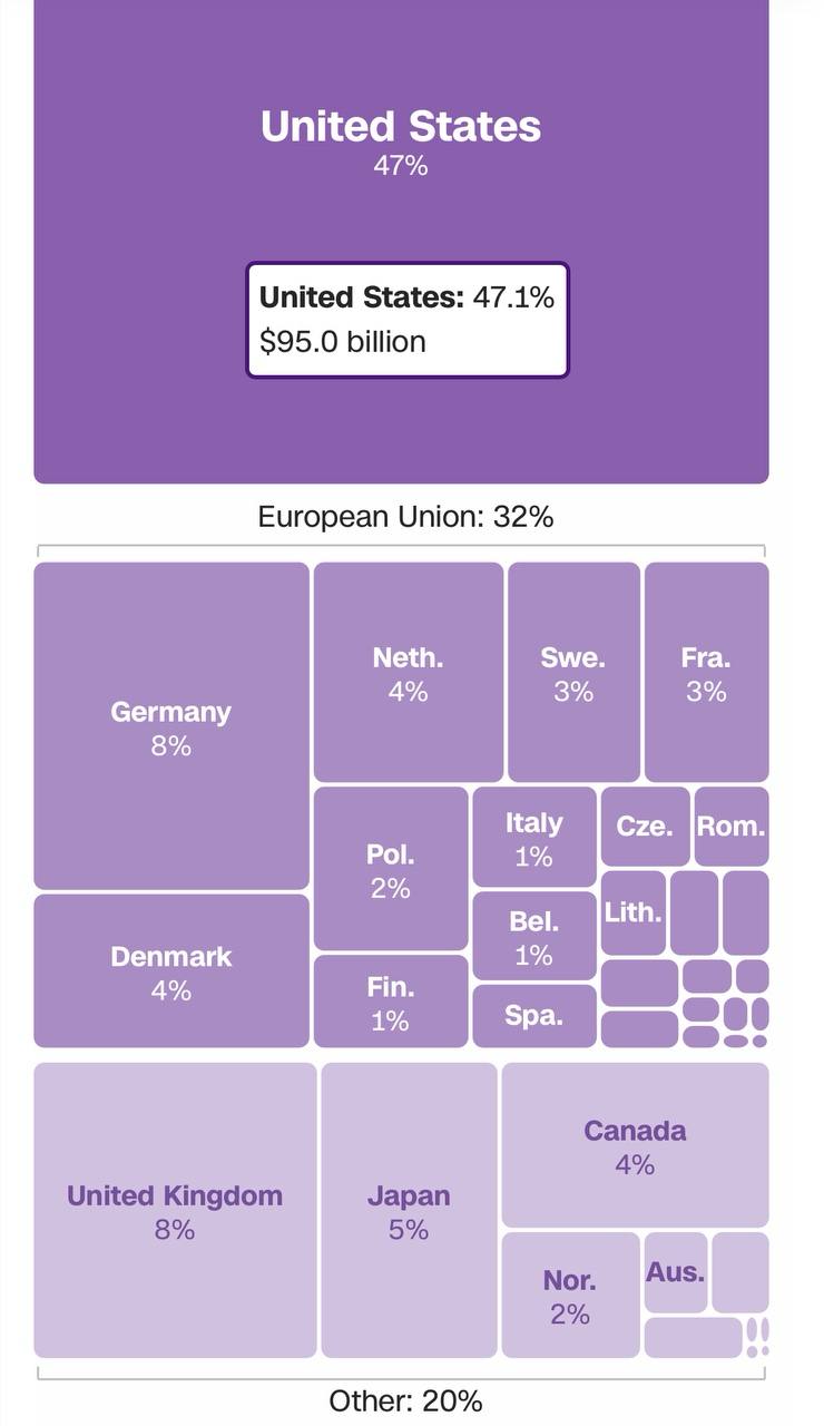 ▫️Почти половина двусторонней помощи Украине поступила от США.