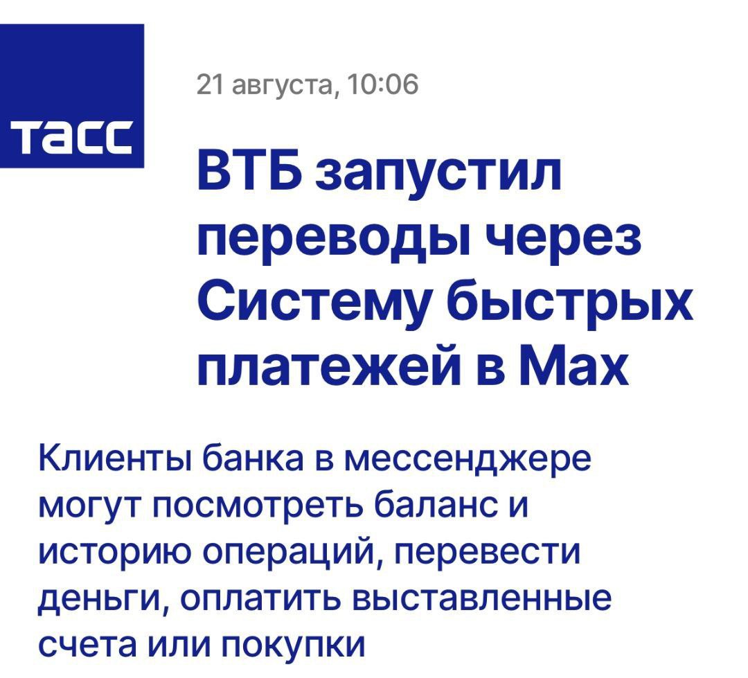 ВТБ запустил возможность денежных переводов через СБП в мессенджере Max