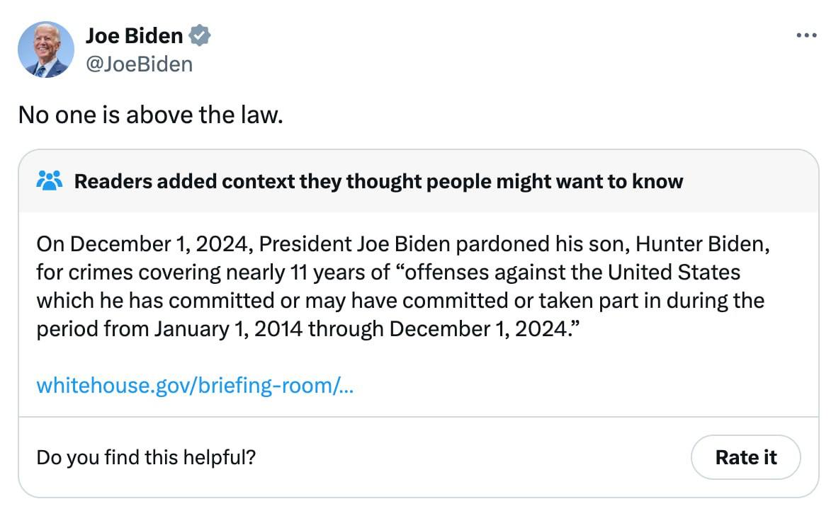 Тем временем под постом Байдена в X со словами «Никто не выше закона» пользователи добавили примечание о помиловании Хантера. Этими словами президент США в июне прокомментировал дело против Трампа о подделке документов.