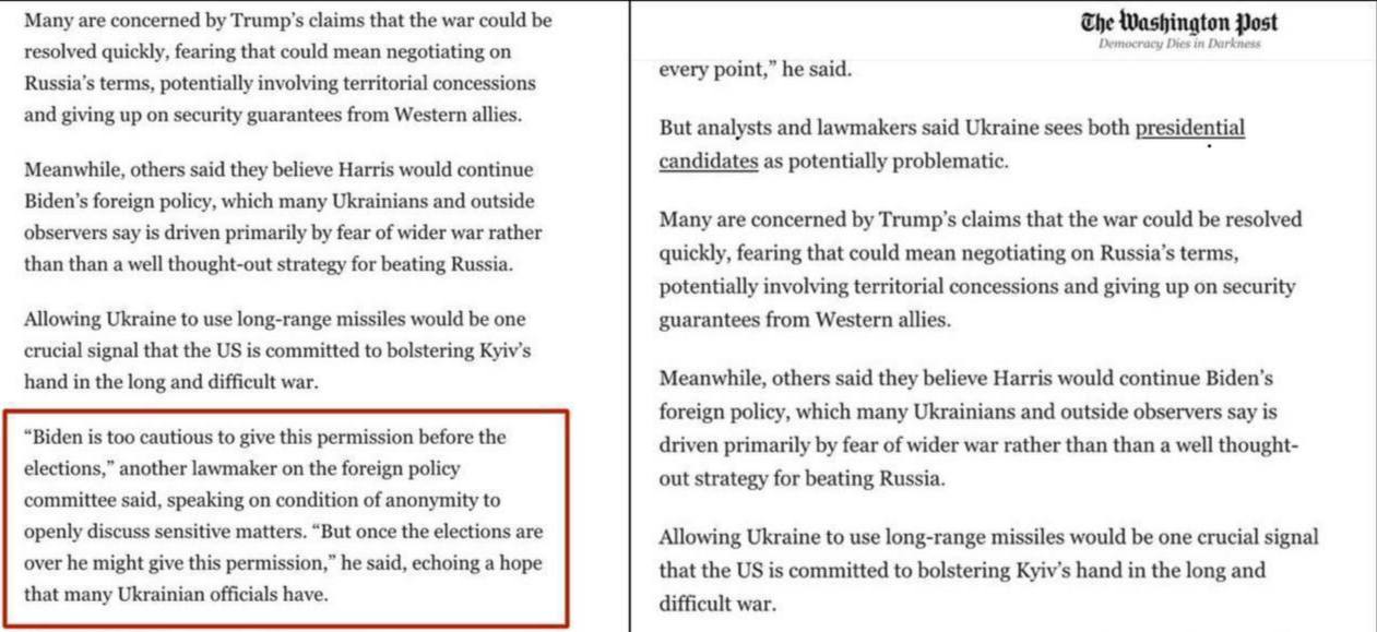 Внезапно из сегодняшней статьи WP пропал абзац про разрешение Байдена бить оружием США по России