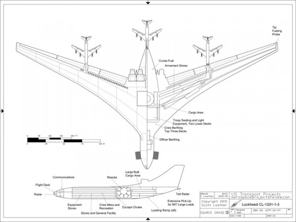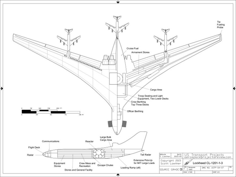 В 1970-х годах компания Lockheed предложила один из самых смелых проектов в истории авиации - CL-1201 - летающий авианосец длиной более 170 метров и размахом крыльев около 183 метров. Этот невероятный проект представлял собой огромный самолёт, способный нести на борту до 74 истребителей или других боевых машин.CL-1201 должен был быть оснащён ядерным реактором для обеспечения длительного полёта без дозаправки, превращавшим его в настоящую летающую базу. В теории, такой авианосец мог бы находиться в воздухе неделями, поддерживая военные операции в любой точке мира.
