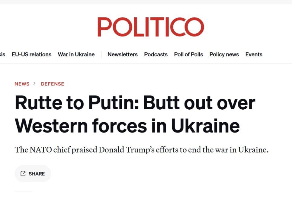 Politico: Россия не должна решать, могут ли западные войска быть отправлены на Украину в рамках любой мирной сделки по прекращению войны - генеральный секретарь НАТО Марк Рютте.
