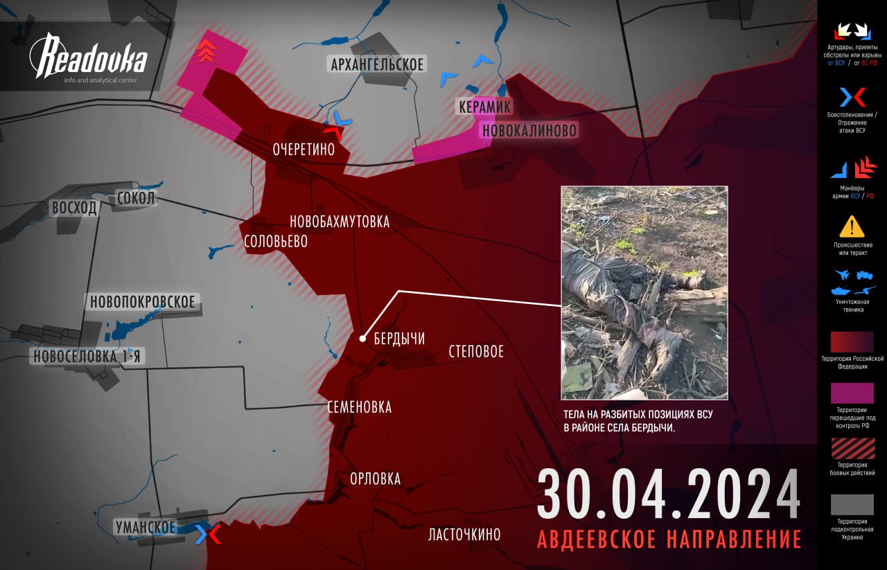 Русские войска продолжают успешно наступать на Авдеевском направлении. Под Бердычами наши бойцы засняли брошенные позиции, буквально заваленные трупами украинских солдат. ВСУ же сейчас сильно ограничены в силах, что мешает украинской армии адекватно реагировать на сложившуюся ситуацию. Все это позволяет нашим войскам действовать по принципу «удара рапирой»: атака вглубь территории врага, на важные логистические узлы ВСУ. Первый из них — Очеретино, русская армия уже взяла его в свои руки.