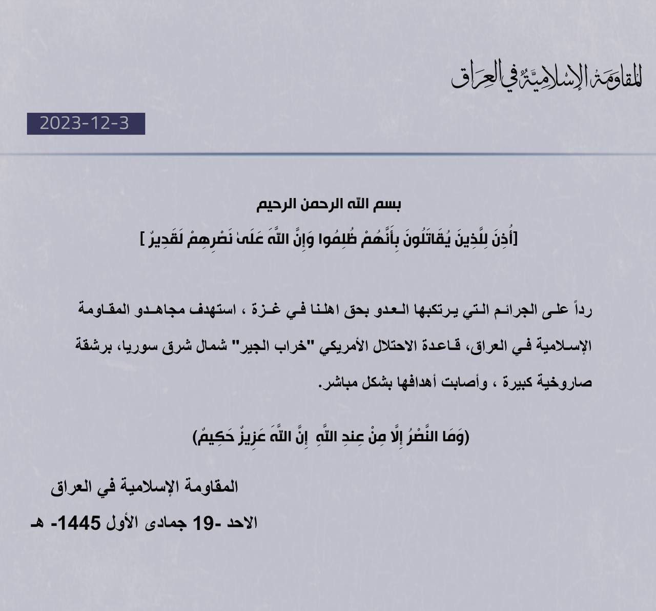Исламское сопротивление нанесло ракетный удар по американской базе Хараб аль-Джир в сельской местности Хасака, Сирия.