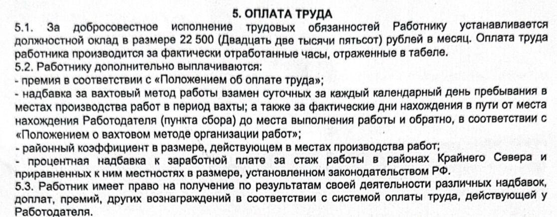 Действительно, в разделе об оплате труда указан оклад в 22,5 тысяч рублей, а также (все в соответствии с законом) районные и северные (кому актуально) коэффициенты. Отдельно там отмечено, что дополнительно работнику выплачивает премия и доплата за вахтовый метод работы со ссылкой на отдельные положения компании. Однако этих документов супруги не видели, и как определяются эти выплаты, осталось неизвестным.