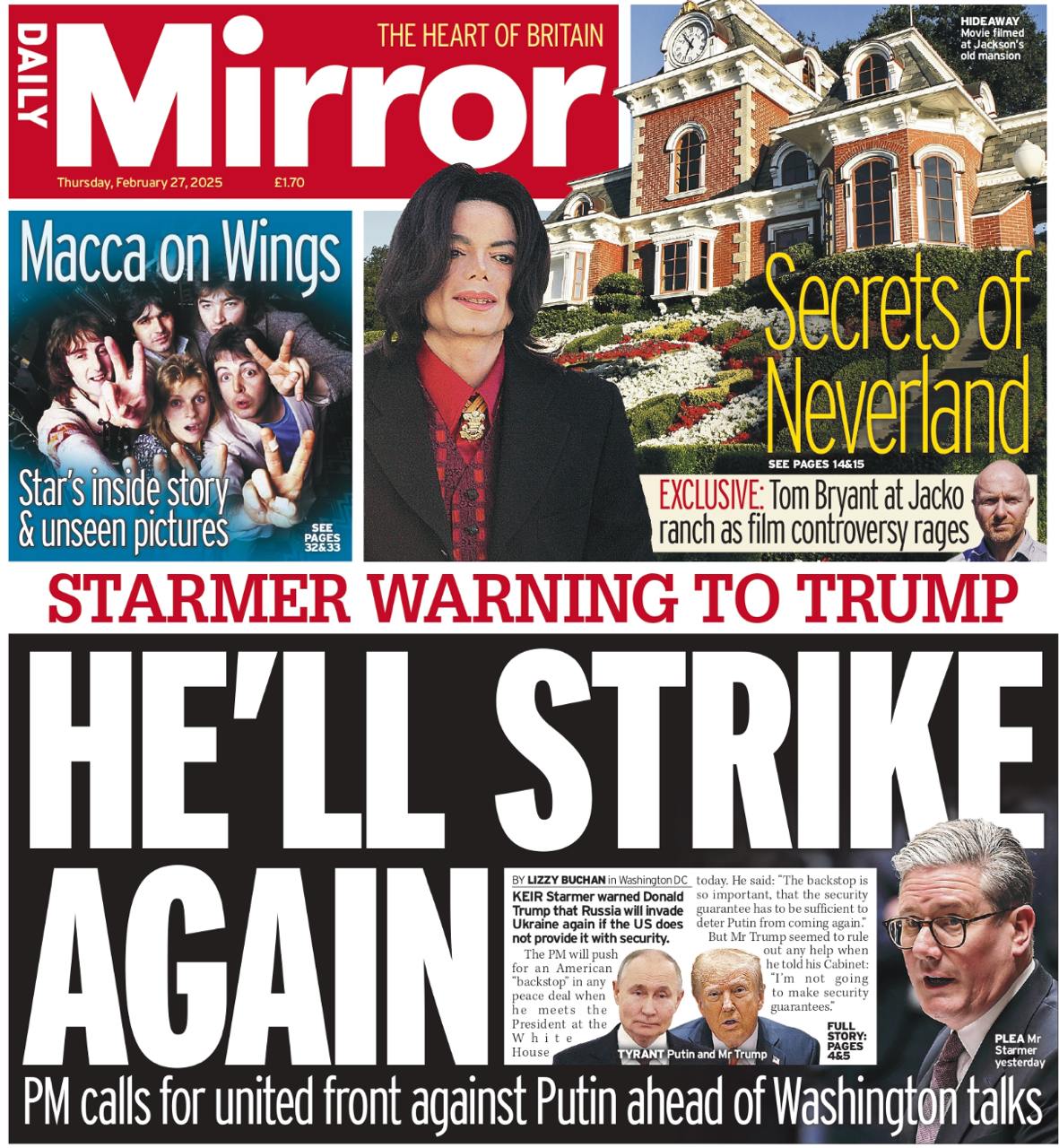 Daily Mirror: «Стармер предупреждает Трампа: ОН УДАРИТ СНОВА. Премьер-министр призывает к единому фронту против Путина в преддверии переговоров в Вашингтоне».