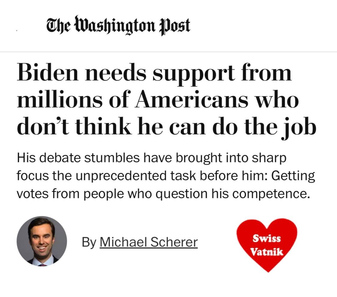 Колумнист американского издания «The Washington Post»назвал состояние действующего (пока!) Президента США Джо Байдена «умственной некомпетентностью». Какое удивительное название для медицинского диагноза старческое слабоумие и прогрессирующей деменции.