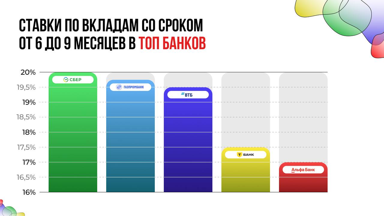 Так высокие ставки были отмечены у Газпромбанка (19,7%), ВТБ (19,5%), Т-Банка (17,5%), Альфа Банка (17%) и Сбера (20%). Примечательно, что Сбер поднял ставку в этот понедельник до 20% на Лучший % и СберВклад, а для премиальных клиентов — до 20,5%-21%.