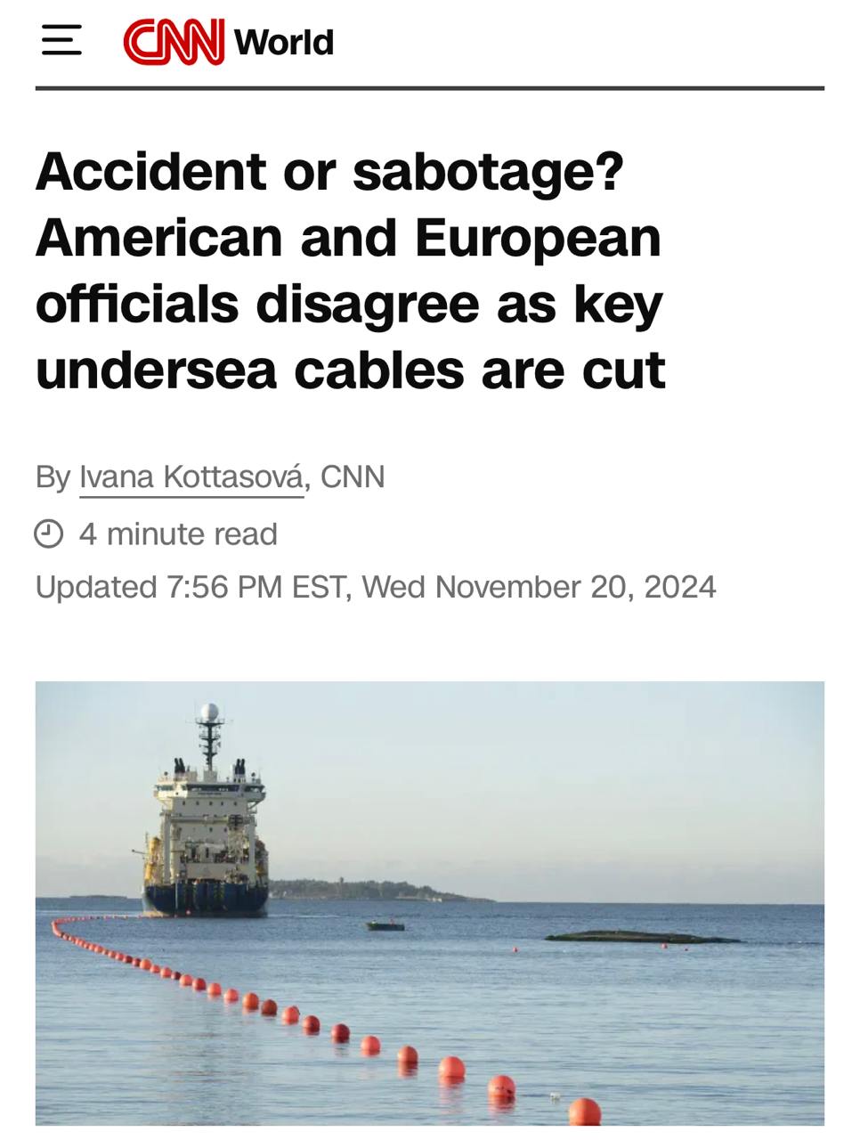 В США не увидели признаков диверсии в инцидентах с повреждением двух кабелей связи в Балтийском море. Скорее всего это был несчастный случай, - CNN