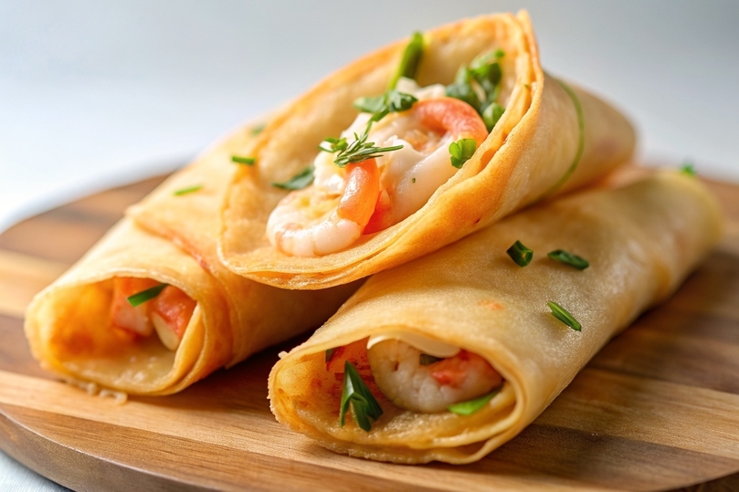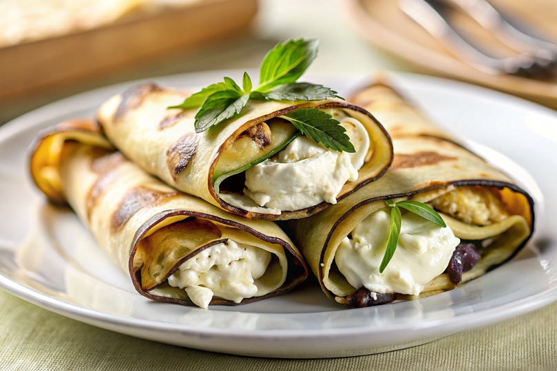 После чего заворачиваем начинку в блин, как в мешочек, горловину скалываем зубочисткой или завязываем, для этого подойдут ленточки сыра косичка.