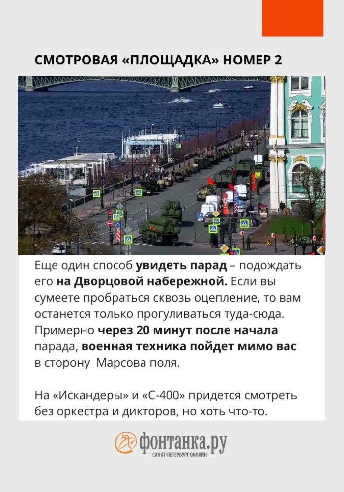 Но шанс посмотреть на марширующих военных и грозную боевую технику есть. Хитростями делится телеграм-канал «Фонтанка SPB Online».