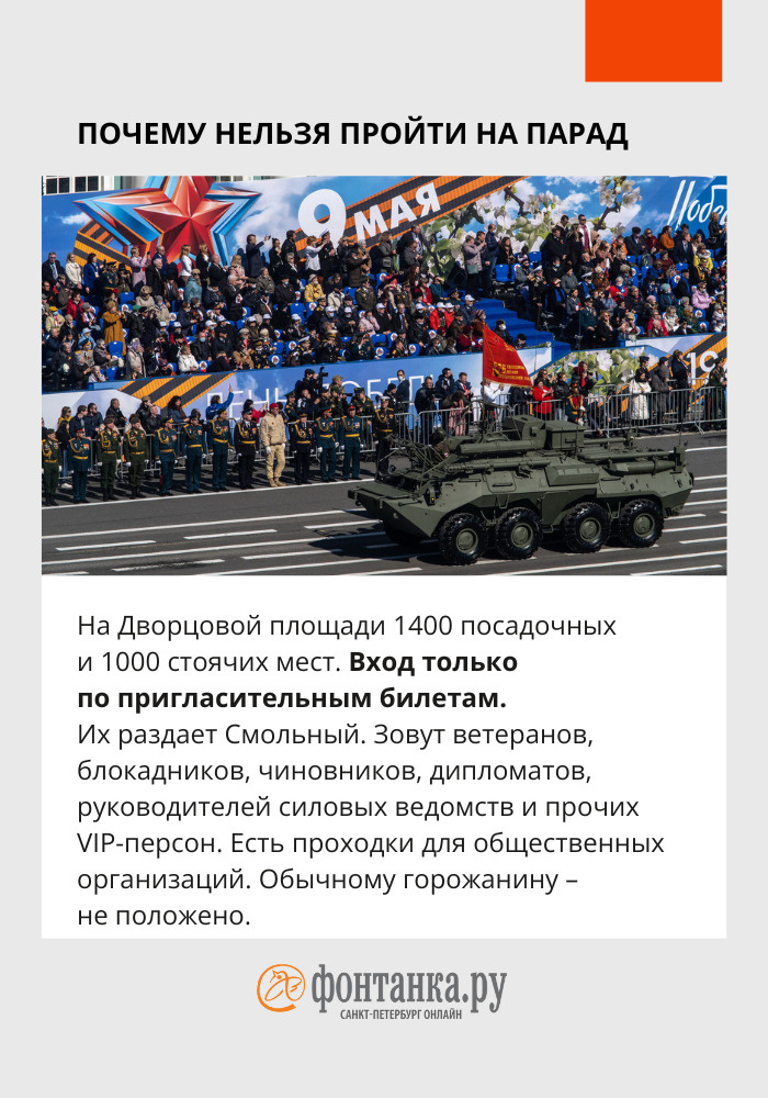Попасть на трибуну и посмотреть парад с лучшего ракурса не получится - вход сюда только по пригласительным билетам, которые распределяет Смольный. Приглашения предназначены для ветеранов Великой Отечественной войны, VIP-персон (например, федеральные чиновники или руководители силовых ведомств), а также распространяются среди районных общественных организаций.