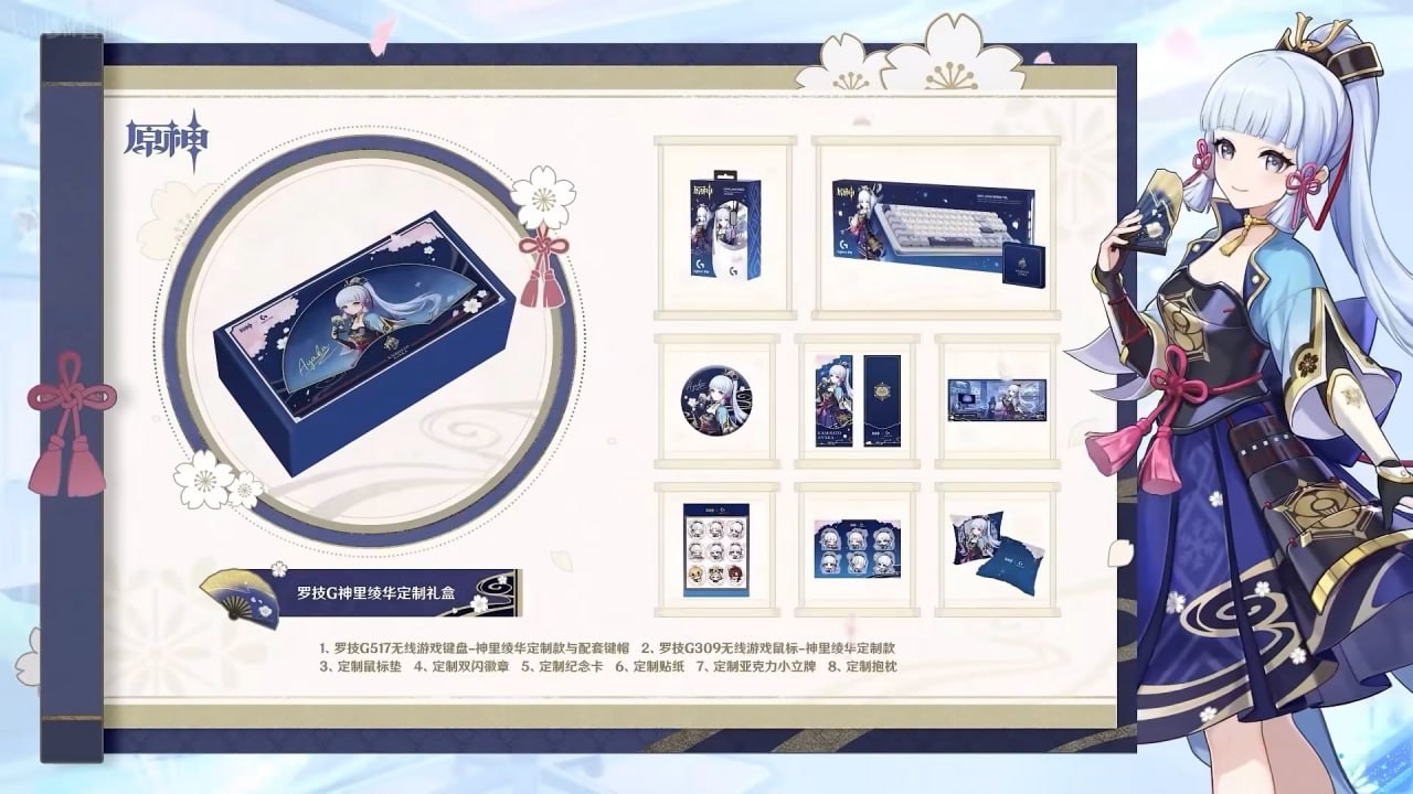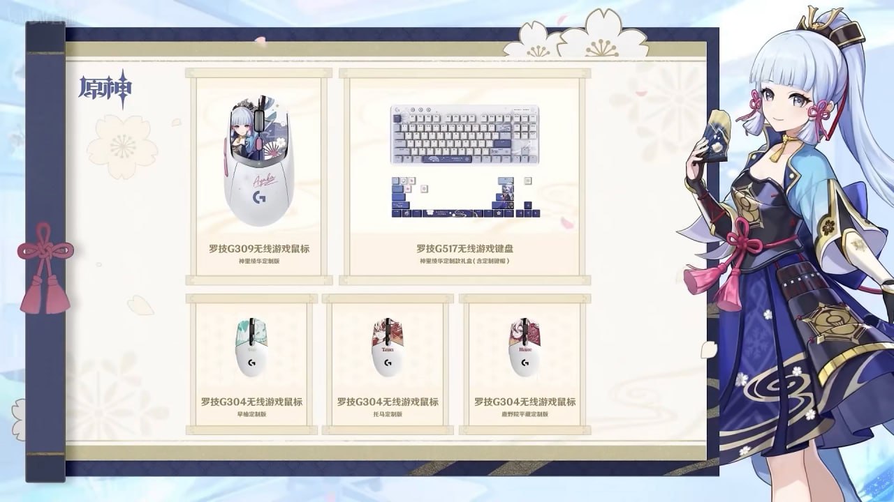 Первый продукт партнёрства — Logitech G309 Lightspeed в стилистике персонажа Камисато Аяки. За ней появится серия беспроводных мышей G305 Lightspeed, оформленных под Саю, Тома и Шиканоина Хейзо.