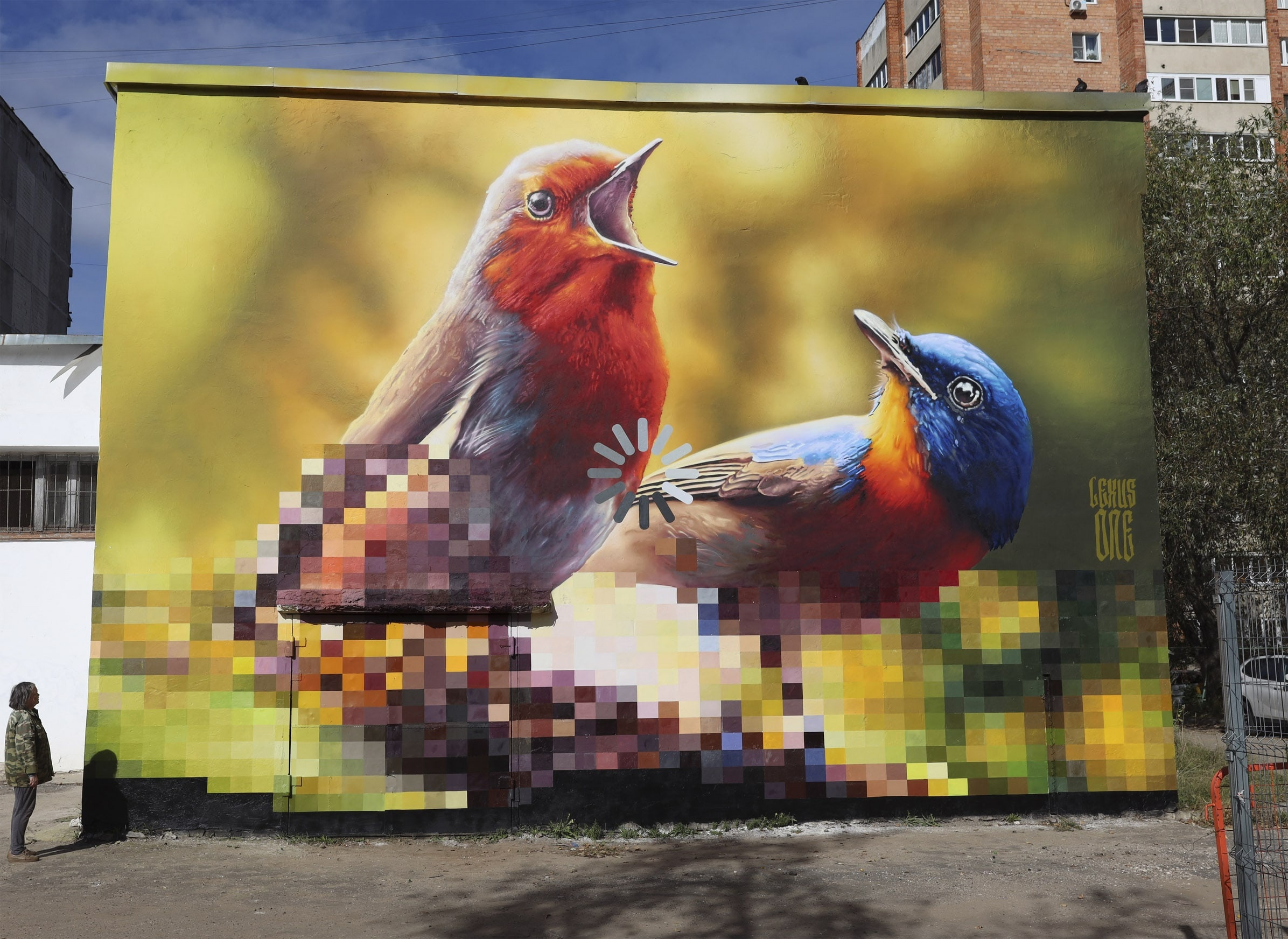 Так, свою новую работу сегодня выложил в сеть стрит-арт художник LexusOne. Молодой человек изобразил на фасаде дома на Мещере двух красивых птиц, одна из которых поет. В центре находится колесо загрузки, которое может появляться на смартфонах и компьютерах. А внизу изображения часть остается за пикселями, как будто намекая зрителю, что пора остановиться и насладиться моментом.