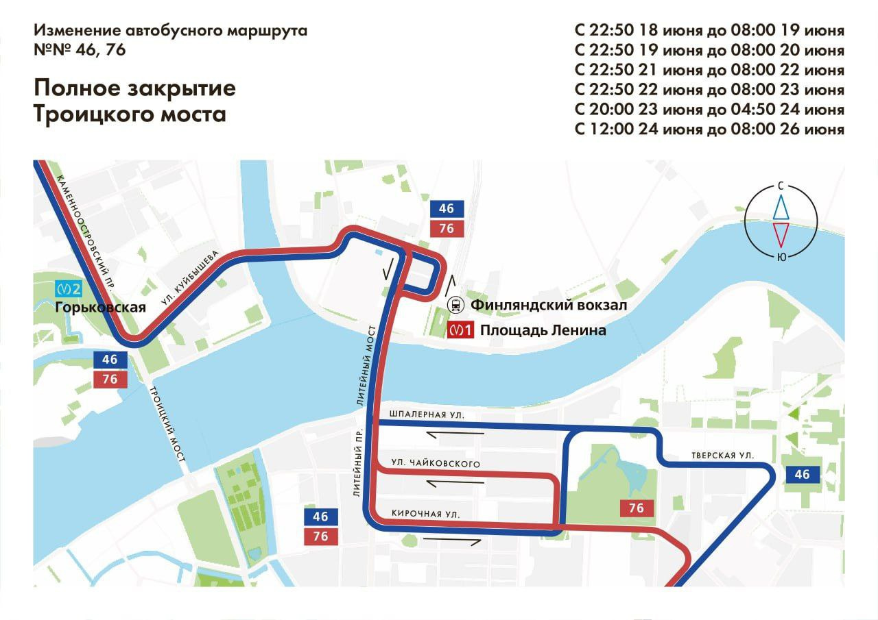 Как сообщает 16 июня пресс-служба комитета по транспорту Петербурга, Троицкий мост будут полностью перекрывать для движения транспорта на следующие периоды: