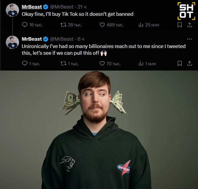 MrBeast (настоящее имя — Джеймс Дональдсон) заявил на платформе X (бывший Twitter): "Ладно, хорошо, я куплю TikTok, чтобы его не забанили". После этого заявления к ютуберу обратились несколько миллиардеров и предложили ему помощь в сделке.