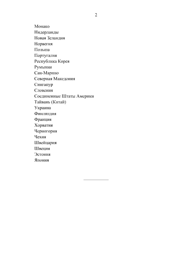 В списке есть США, Великобритания, Украина и почти все европейские страны, кроме Сербии, Венгрии, Боснии и Герцеговины, Словакии и Молдавии. Также в перечне упомянуты Япония, Южная Корея, Новая Зеландия, Микронезия и Багамы.