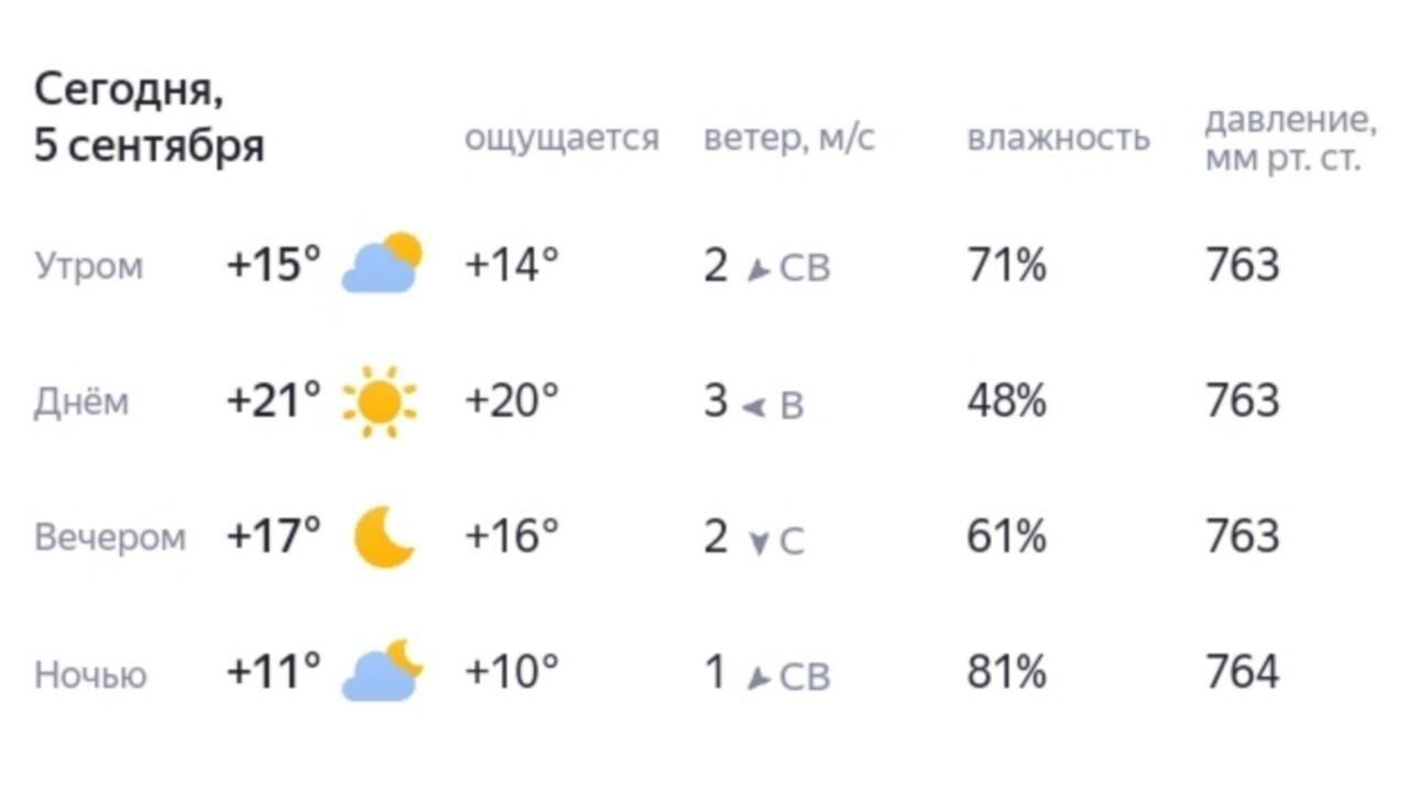 В пятницу, 5 сентября, средняя температура воздуха в Югре составит от +18 до +23 градусов днем, и от +5 до +10 градусов ночью. Также прогнозируют кратковременные дожди в южной и западной частях, а также повсеместный туман. Ветер — северо-восточный, 2-7 м/с.