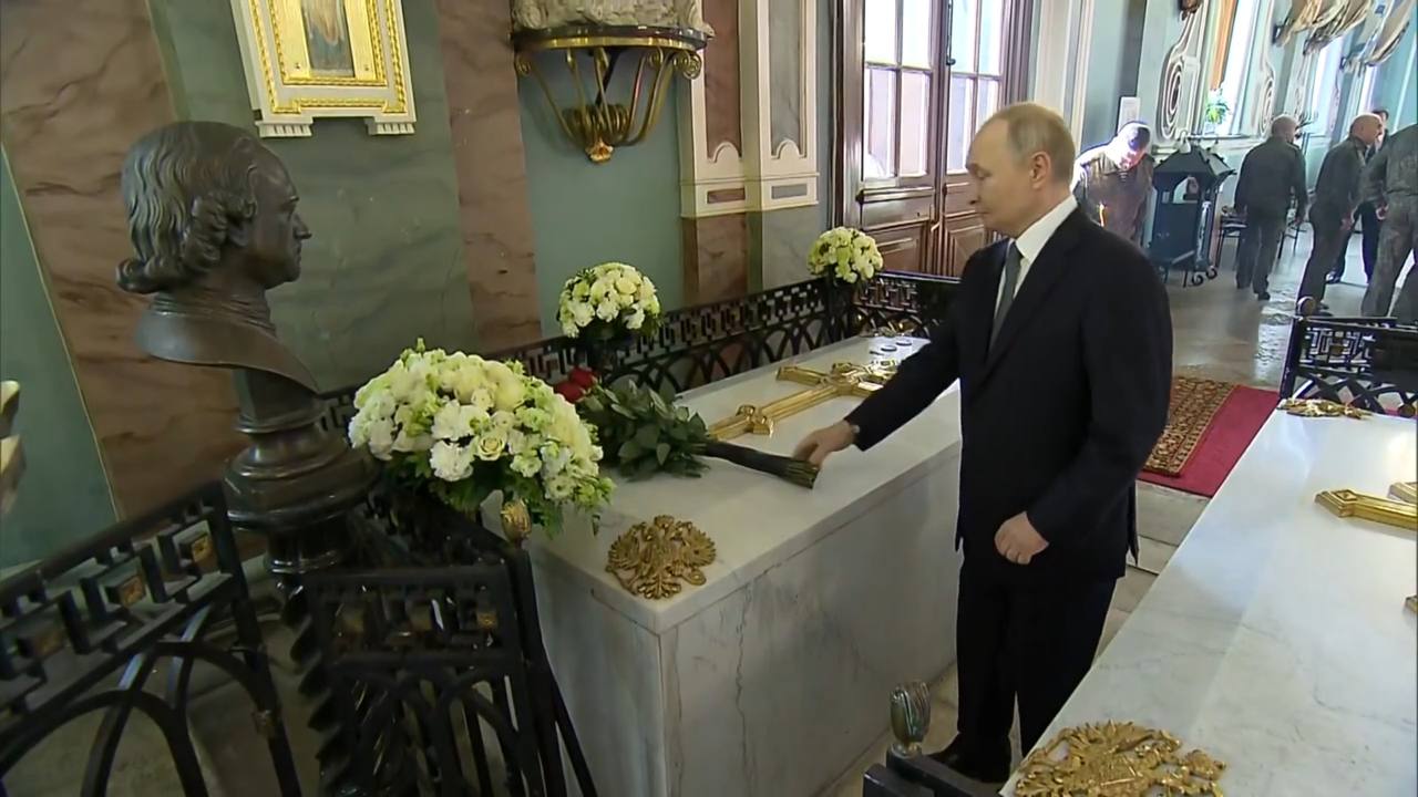 В свой День Рождения Президент России Владимир Путин встретился с военными в Петропавловском соборе, далее провел с ними встречу в зале, стены которого украшали портреты Русских Императров.
