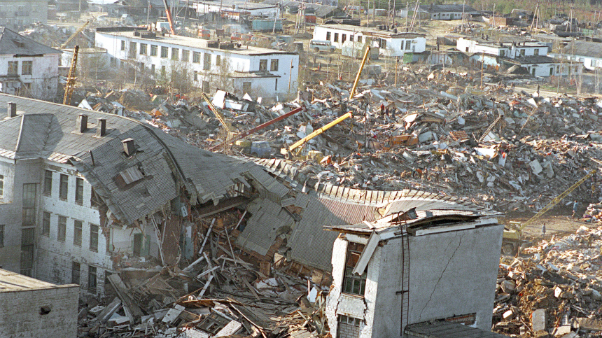 Пятитысячный городок нефтяников. Ученые до сих пор спорят, где был эпицентр землетрясения. Первый же толчок магнитудой около 9 буквально снес всю инфраструктуру. 17 панельных многоэтажек, клуб, столовая рухнули, рассыпались. Дальше серия афтершоков вызывает пожар в двух разрушенных многоэтажках, загорается газ, к утру вспыхивают еще два дома.
