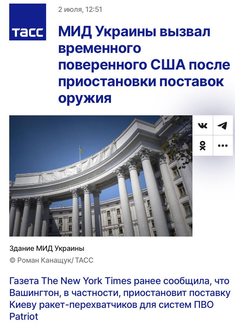 МИД Украины вызвал временного поверенного в делах США в Киеве Джона Гинкеля после того, как стало известно о приостановке поставок Вашингтоном некоторых вооружений, в том числе ракет для ПВО Patriot. Об этом говорится в сообщении на сайте украинского ведомства.