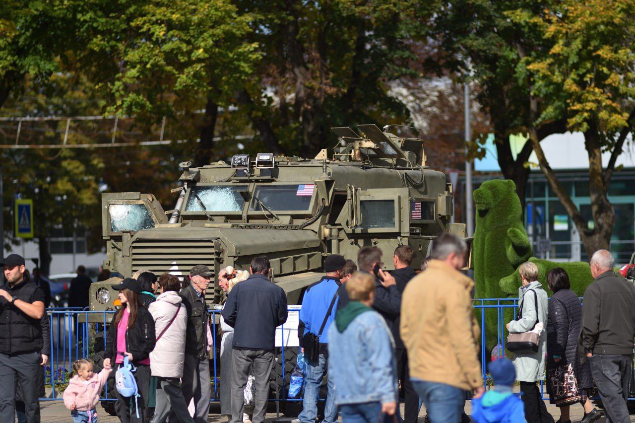 Британские, шведские и немецкие БМП Spartan, CV90 и Marder 1A3, а также американский бронеавтомобиль International MaxxPro на выставке трофейной техники в Майкопе.