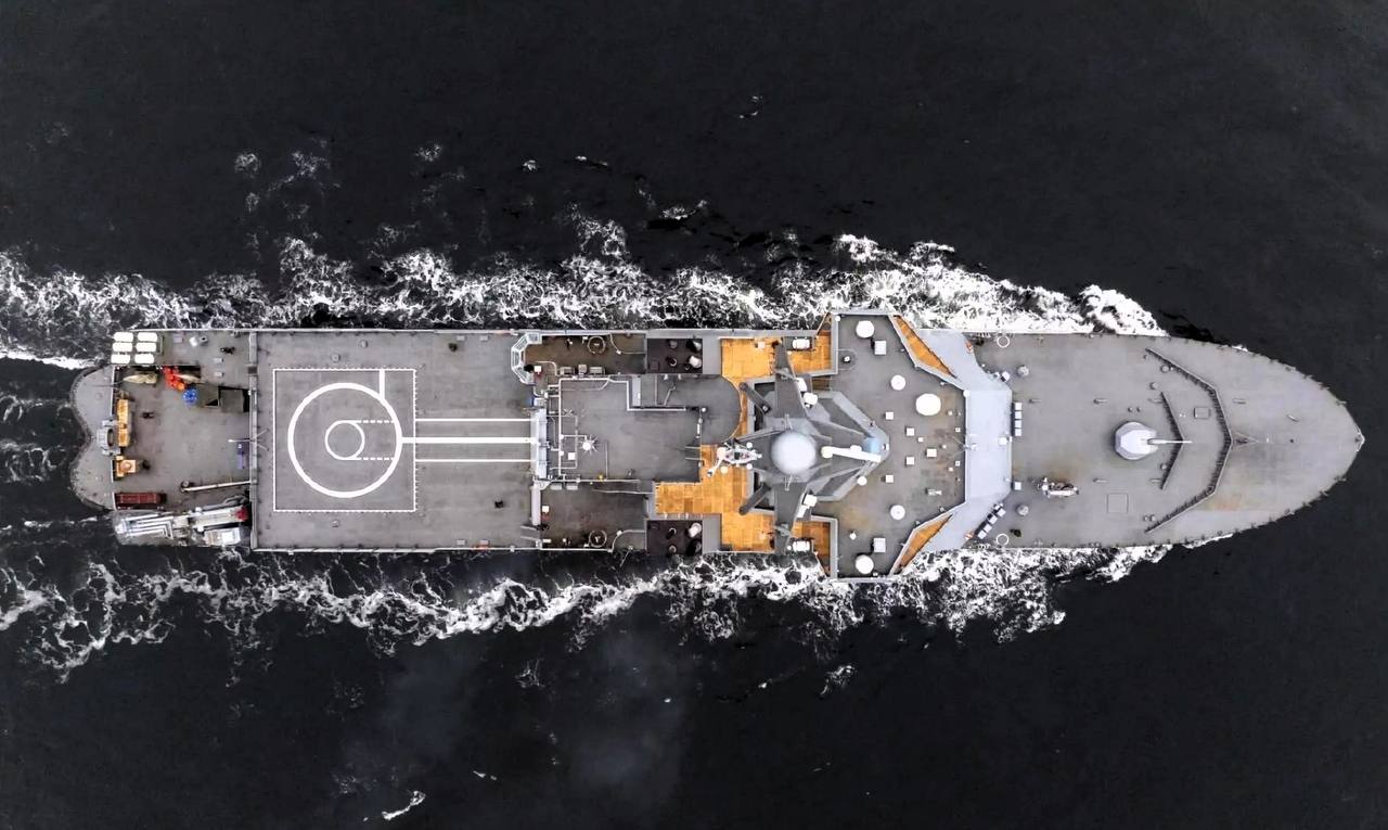 Вид сверху на новейший патрульный корабль ледового класса проекта 23550 "Иван Папанин" ВМФ РФ. Наши дни.