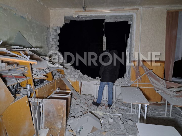 Одним из массированных ударов нанесен ущерб школе №85 в поселке Абакумова в Кировском районе Донецка - вражеский снаряд прямым попаданием разрушил стену школьного здания.
