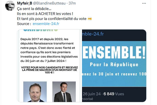 Французские пользователи X (Twitter) обнаружили необычную рекламу партийного объединения Ensemble - https://ensemble-24.fr/, так называемого «президентского большинства», в которую входят несколько французских партий, включая партию Эммануэля Макрона Ренессанс. На сайте Ensemble представлен список кандидатов от коалиции, над которым размещен призыв приходить на выборы 30 июня и 7 июля и проголосовать.