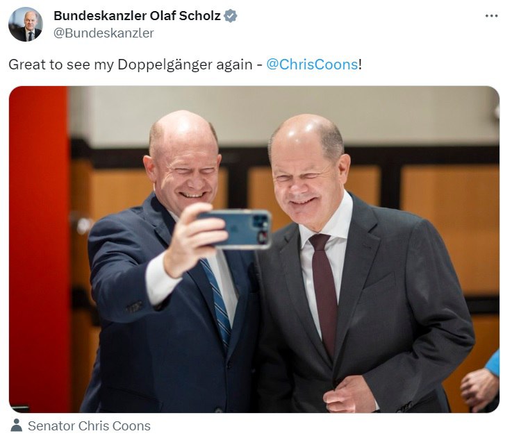 Олаф Шольц опубликовал фото со своим двойником из США, сенатором-демократом Крисом Кунсом.