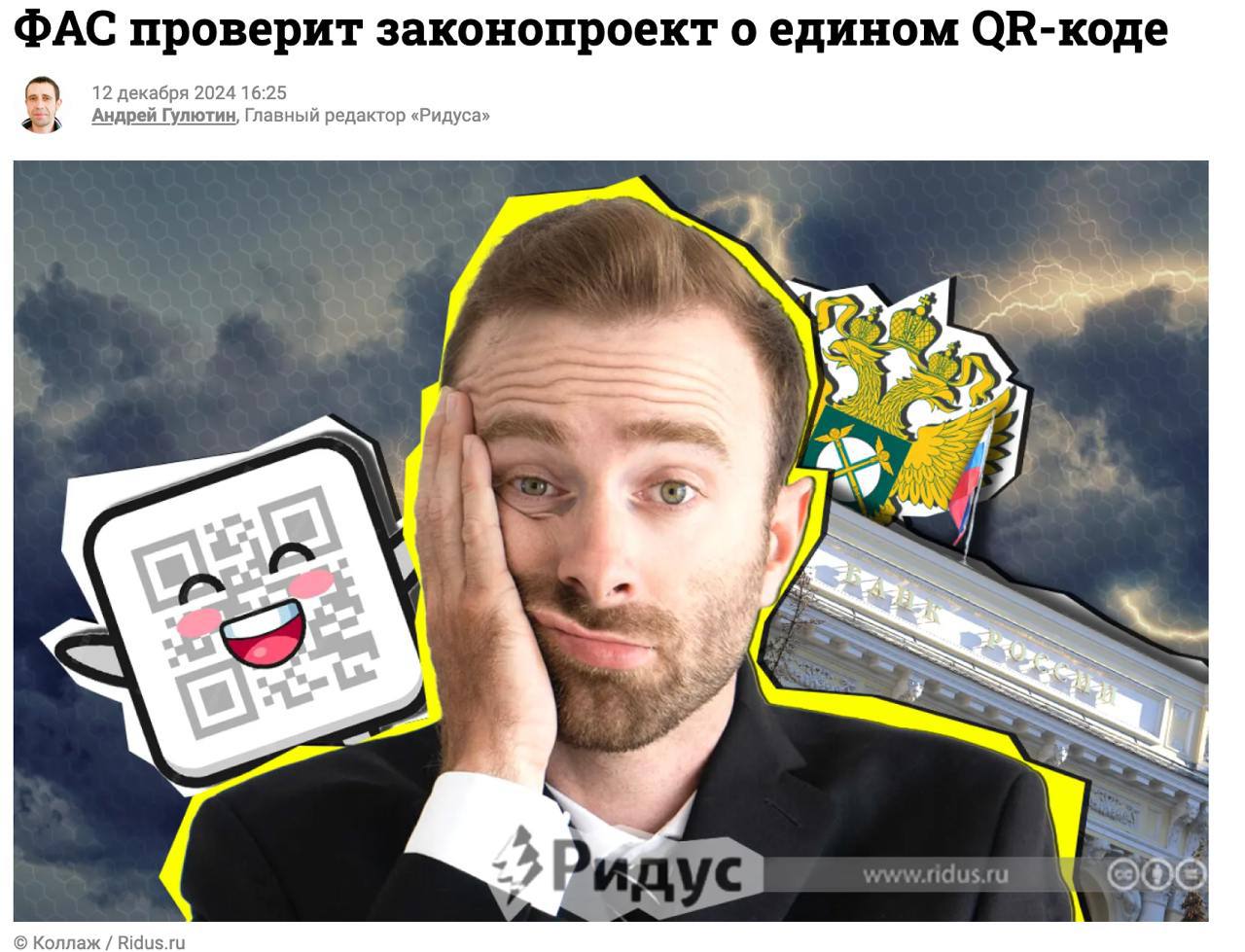 Федеральная антимонопольная служба проверит законопроект о внедрении универсального платёжного QR-кода от НСПК на соответствие требованиям антимонопольного законодательства. Официальную жалобу в ФАС подал и опубликовал главред издания «Ридус» Андрей Гуляев.
