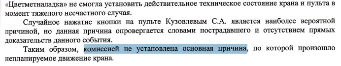 Однако в выводах комиссии было отмечено, что кран регулярно обслуживали. В 2020–2021 годах он проходил полное и частичное техническое освидетельствование. Сразу после ЧП с Кузовлевым кран осмотрели специалисты, его тормоза и механизмы подъема признали исправными. Эксперты сделали вывод, что Сергей мог случайно нажать кнопку на дистанционном пульте, отчего кран и двинулся с места.