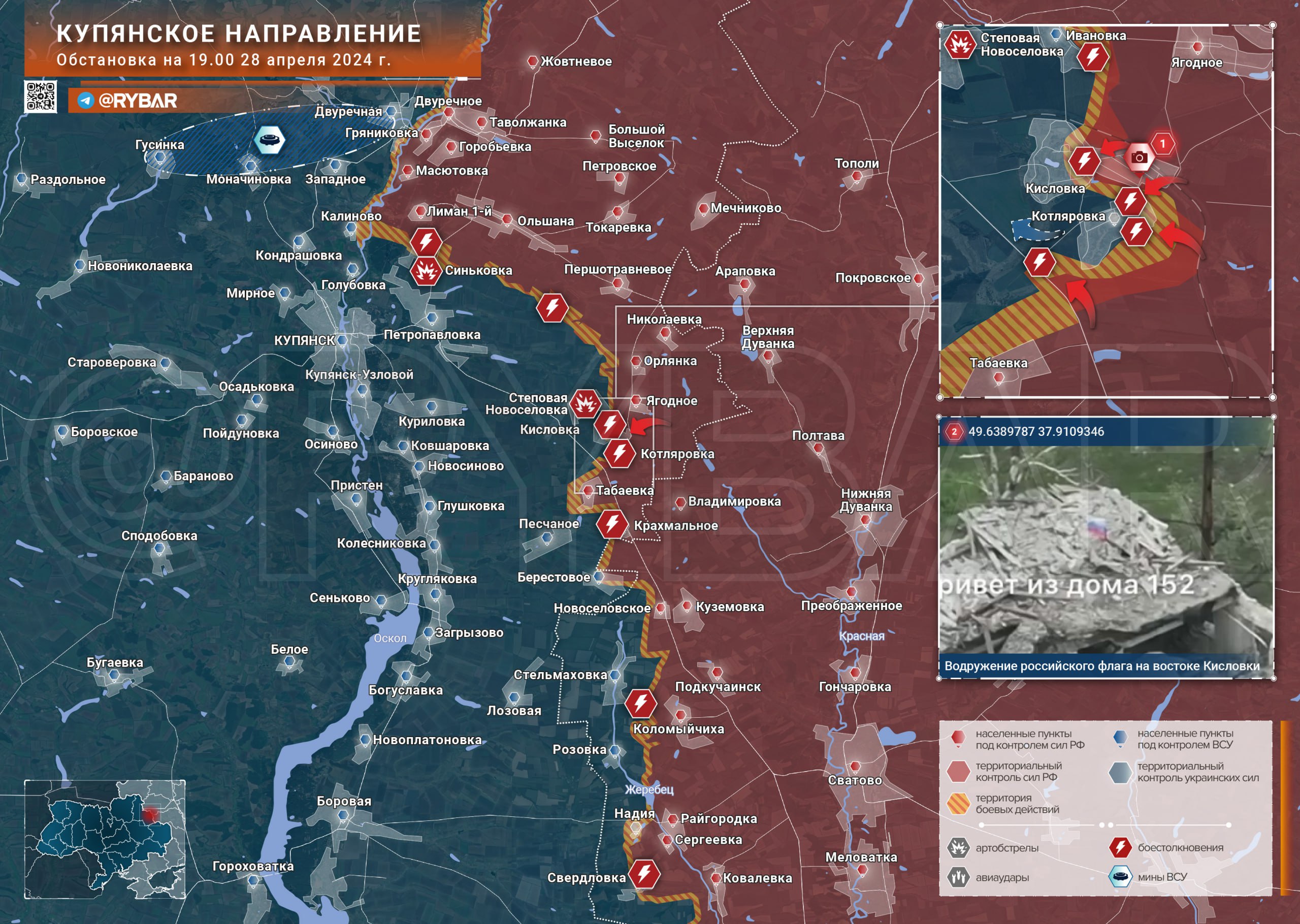 Военнослужащие 272-го полка 47-й танковой дивизии ВС РФ установили контроль как минимум над восточной частью Кисловки и водрузили там российский флаг. Судя по всему, подразделения 104-й бригады ТрО ВСУ были вынуждены отойти либо на запад села, либо в соседнюю Котляровку.