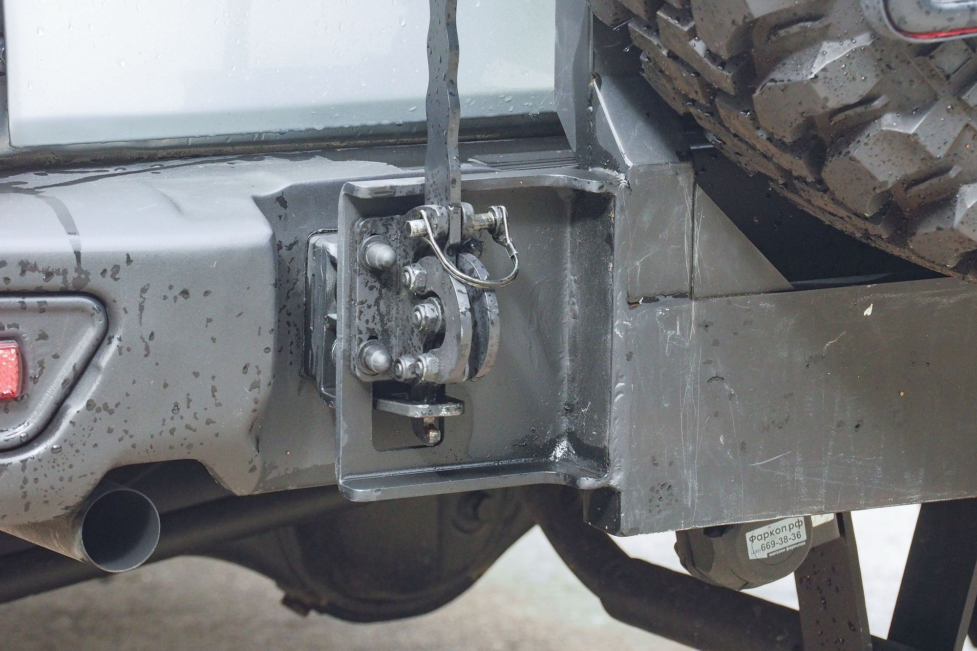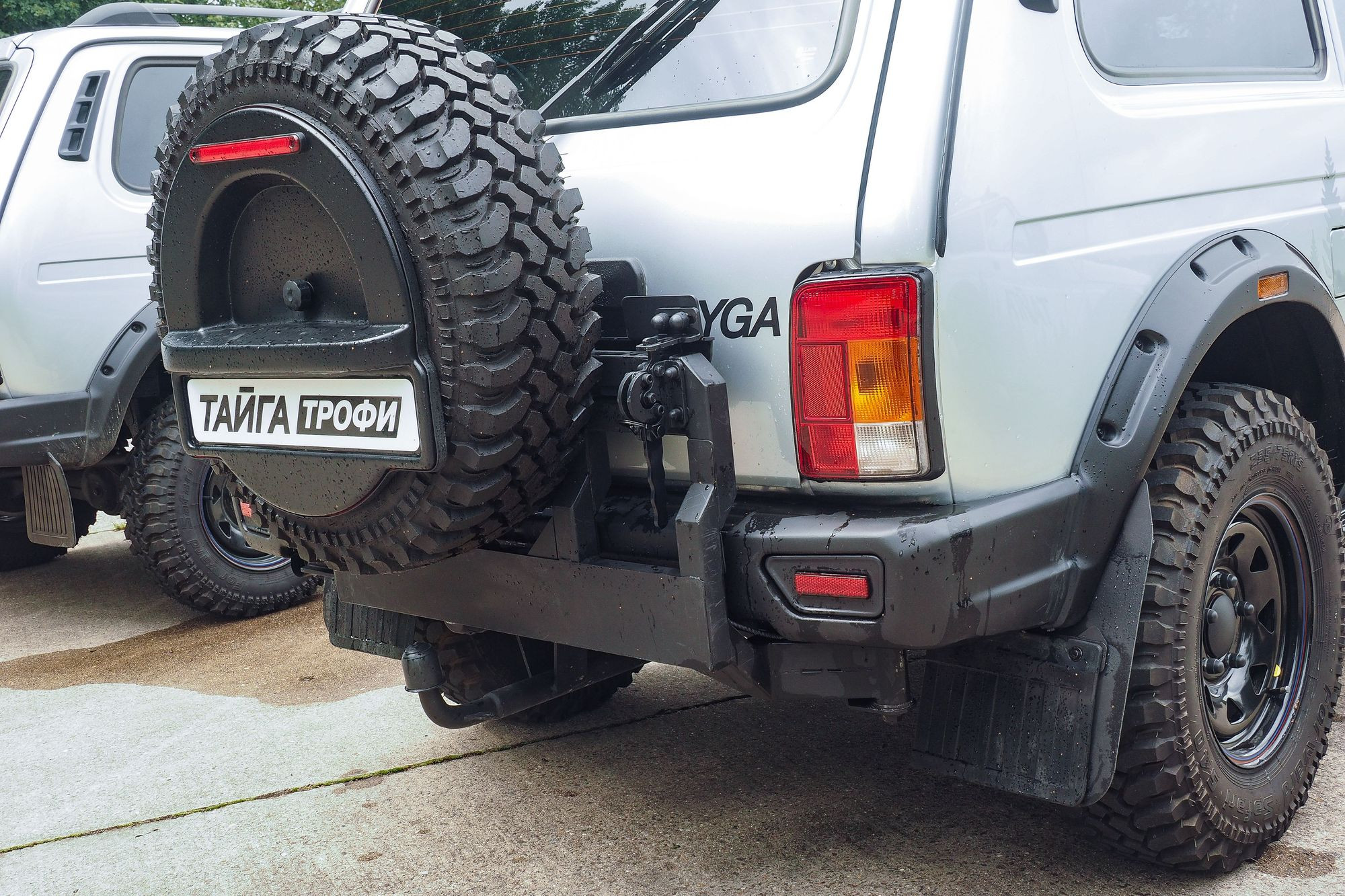 Кроме того, в последнем случае пришлось изменить способ хранения запасного колеса. У Тайги оно разместилось под капотом, как у обычной Нивы, а вот Трофи пришлось оснастить специальным кронштейном (джиперы обычно называют его «калиткой»), на котором и повисла запаска. Кронштейн выглядит весьма солидно и снабжен аж двумя фиксаторами.