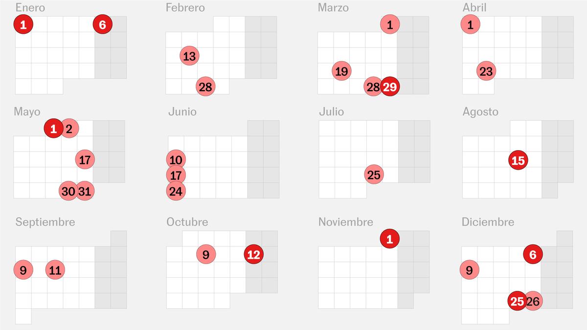 Son ocho las jornadas no laborables este año: 1 de enero (Año nuevo); 29 de marzo (Viernes Santo); 1 de mayo (Día del Trabajo); 15 de agosto (Asunción de la Virgen); 12 de octubre (Fiesta Nacional de España); 1 de noviembre (Todos los Santos); 6 de diciembre (Día de la Constitución Española) y 25 de diciembre (Natividad del Señor).
