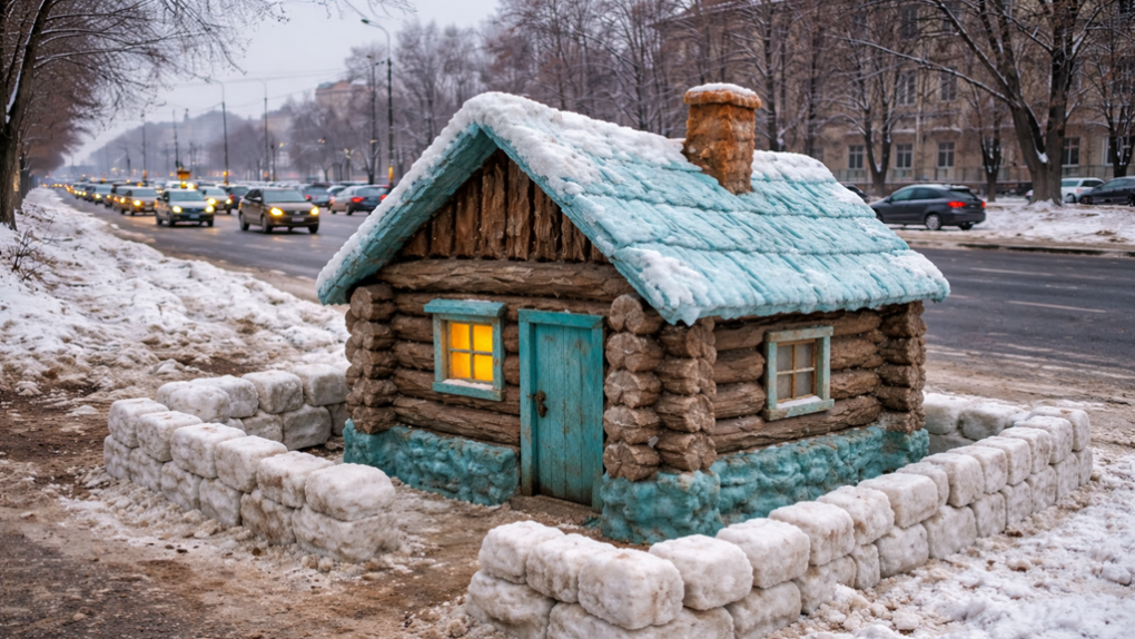 Постройка выкрашена в коричневый и бирюзовый цвета и визуально напоминает деревянный дом. Вокруг неё выложены «кирпичи» из снега, образующие что-то вроде рва.