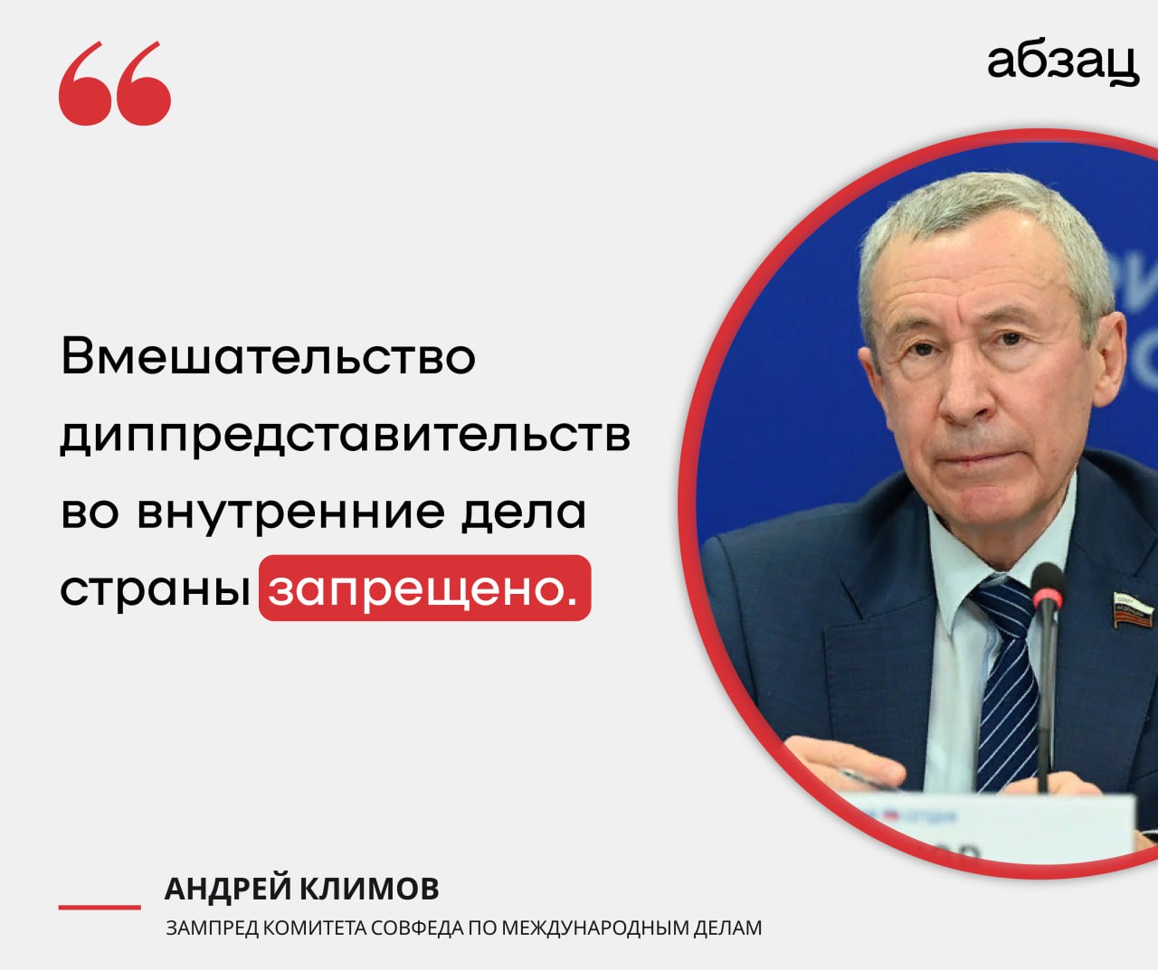 Попытки европейских дипломатов вмешаться в выборы выявляются, виновные понесут наказание. Об этом в разговоре с «Абзацем» рассказал глава комиссии Совфеда по защите государственного суверенитета и предотвращению вмешательства во внутренние дела РФ Андрей Климов: