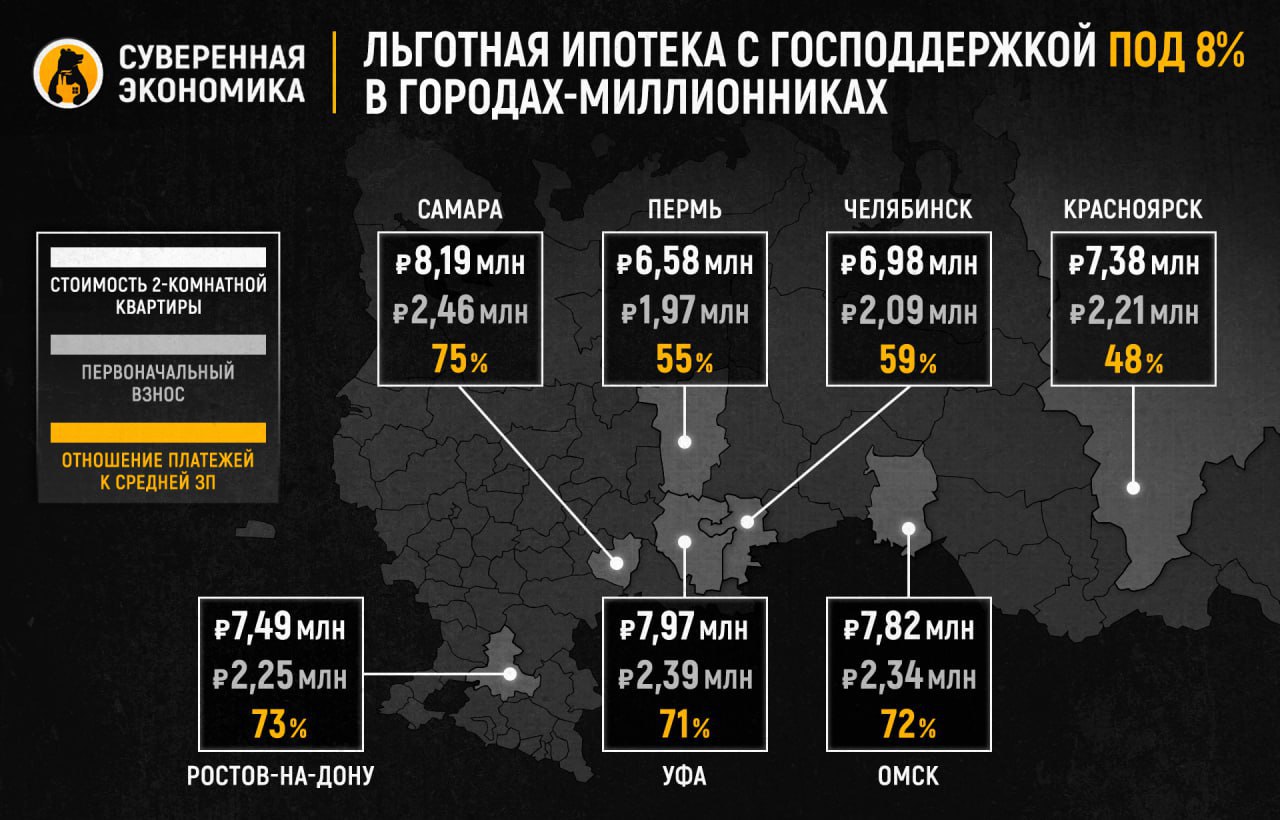 «Суверенная экономика» проанализировала доступность льготной ипотеки в российских городах-миллионниках. Оказывается, что под условия займа на целых 30 лет с минимальным взносом 30% подойдут не все региональные центры. Например, из 16 городов лишь 11 пройдут по критерию минимального первоначального вклада.