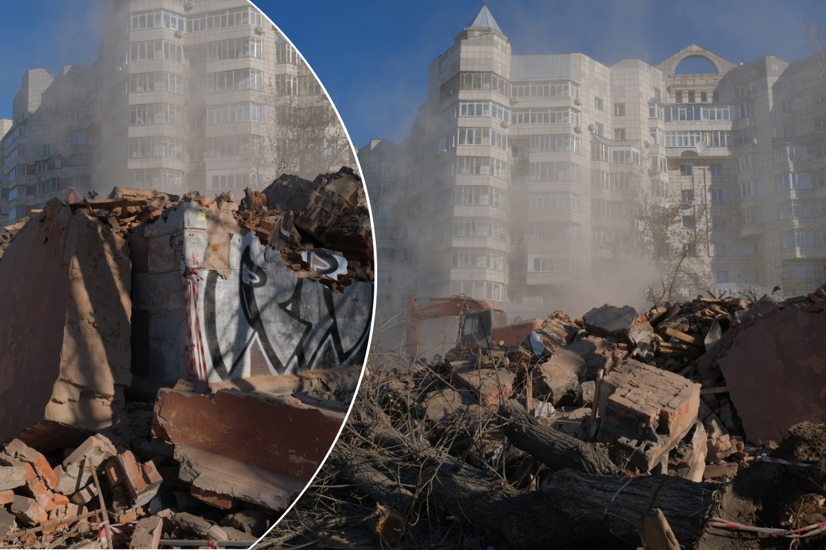 Рядом с перекрестком улиц Стахановской и Карпинского работают экскаваторы, от некоторых домов остались только нижние части стен и кирпичи. Тут же лежат ветки деревьев, вокруг стоят облака строительной пыли.