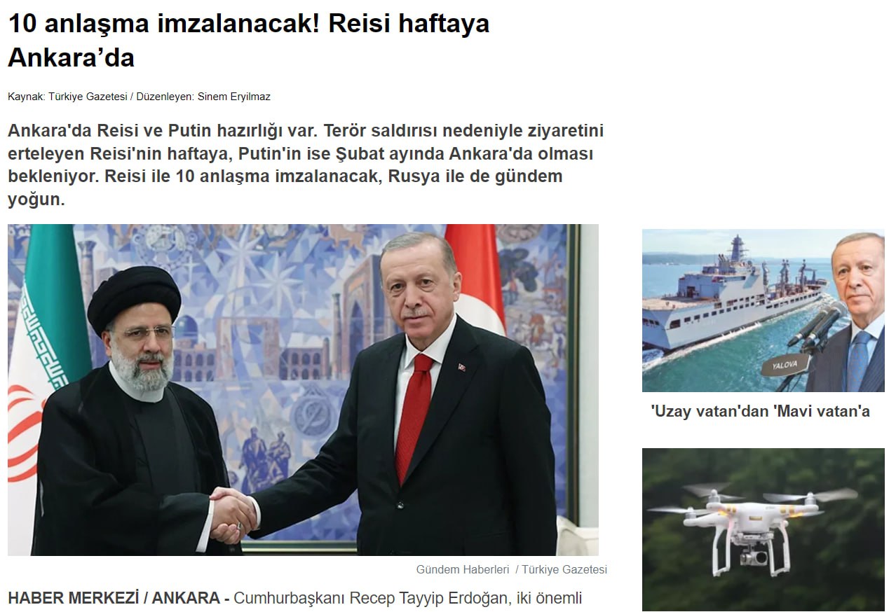 Президент Реджеп Тайип Эрдоган готовится принять двух важных гостей. Ожидается, что глава Ирана Ибрагим Раиси, отложивший свой визит из-за теракта в городе Керман, прибудет в Турцию 24 января, а российский лидер Владимир Путин - 12 февраля.
